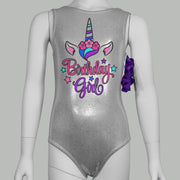 Make your little one's birthday unforgettable with our Birthday Girl Unicorn Leotard! This stunning leotard features a purple mystique fabric back side, making your child stand out in every flip and tumble. As an added bonus, it comes with a matching hair scrunchie for the perfect birthday ensemble. Get ready for a magical celebration!