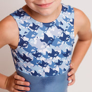 This gymnastics leotard features a playful print of camouflage sharks in a trendy light blue color. With a comfortable tank style, it's perfect for your little gymnast to feel "Jawsome" during practice. It also comes with a matching hair scrunchie!