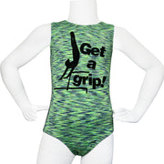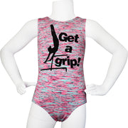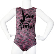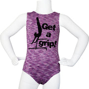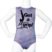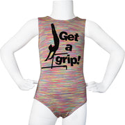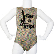 Get a grip on your gymnastics goals with this motivational leotard! The playful design will definitely turn some heads, and the included matching hair scrunchie adds the perfect touch. This comfortable leotard features a contrasting black back side and comes in a variety of colors, so you can choose the one that best fits your personality. Practice your uneven bars routine in style with this fun and quirky leotard!