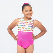 Elevate your young athlete's training sessions with this deliciously vibrant fuchsia pink Macaroons leotard! The adorable macaroons print adds a fun touch, and the included hair scrunchie completes the look. Stand out and make a statement with this must-have leotard.