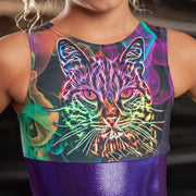 The Neon Electric Cat Leotard from AERO Leotards is perfect for young gymnasts. Featuring a unique cat print and a matching hair scrunchie, this leotard stands out with vibrant purple Mystique Spandex.