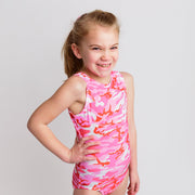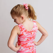 Perfect for young gymnasts who love to tumble and make a statement! Comfortable and stylish pink camouflage design with matching hair scrunchie included.