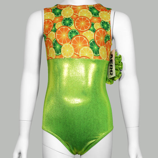 Get ready to leap and twist in style with our Citrus Leotard! This colorful and comfortable gymnastics leotard comes with a matching hair scrunchie...