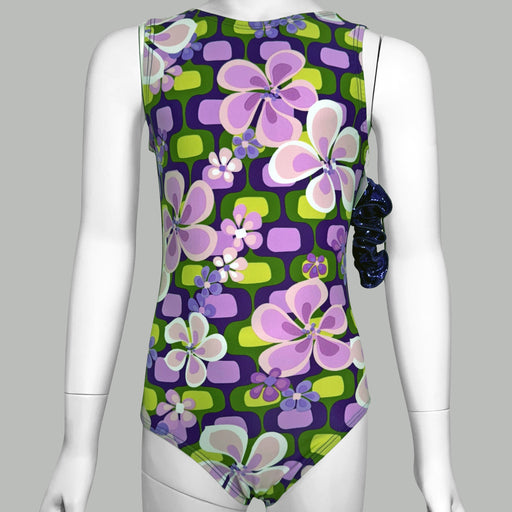 Vibrant purple leotard with geometric floral prints and a scoop-back tank design. Features a printed Lycra front, purple Mystique back, and traditi...