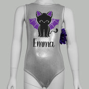 This fun and festive leotard is perfect for your little girl's gymnastics Halloween costume. The purple Mystique back side and custom personalized bat print will make her stand out. Suitable for kids and teens, this leotard comes with a matching hair scrunchie.