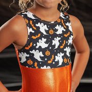 This orange Mystique leotard features a classic scoop-back tank silhouette with a traditional leg cut. The front of the leotard is printed with a cute Halloween-themed design, while the back is solid orange. This leotard also comes with a matching hair scrunchie, perfect for pulling your hair back into a cute ponytail or bun. Whether you're headed to the gym or the dance studio, this leotard is sure to get you into the Halloween spirit!