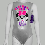 Celebrate your little one's birthday in style with our Birthday Puppy Dog Leotard! This adorable leotard comes with a matching hair scrunchie and is customizable with their name and age. Stand out with the vibrant pink or purple backside. It's perfect for gymnastics and guaranteed to bring a smile to their face!