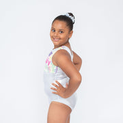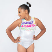 Looking for a personalized leotard for gymnastics? Check out the Silver Name Leotard from AERO Leotards! Made from Mystique Spandex with a matching hair scrunchie, it's durable and stretchy for all your gym moves. Personalize it with your name and get ready to compete in style!