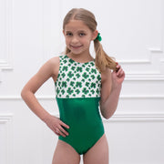 Dress up for the luckiest day of the year with our Four Leaf Clovers St. Patrick's Day Leotard! Complete with a matching hair scrunchie for a festive look. Perfect for dance class and gymnastics or a St. Patrick's Day parade, this leotard will keep you comfortable and stylish.