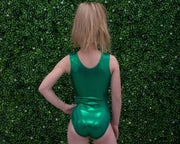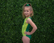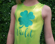 Do you want to be the luckiest gymnast at your meets? Have the best leotard to show off your skills? You need the Lucky Leotard! Made with Mystique Spandex, this leotard is sure to make you stand out. It is also personalized with your gymnasts name on it. The matching hair scrunchie included adds the perfect touch. The glittery shamrock design on the lime front and contrasting green back is sure to get you noticed. So don't wait, get your Lucky Leotard today!
