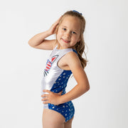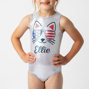 Looking for a leotard that will make your little gymnast stand out? You'll want to check out our Patriotic Cat leotard! Made with Mystique Spandex, it's not only perfect for routines, but also features a striking blue and silver star fabric on the back. And for an extra special touch, personalize it with your child's name. Don't miss out on the chance for your little one to show their love for country and gymnastics in style!