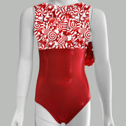Show your Christmas spirit! This leotard features a peppermint candy cane sweets design and red Mystique Spandex. Matching hair scrunchie included. The leotard is made with Mystique Spandex.