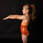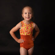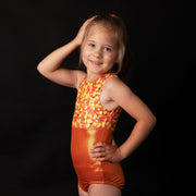 This adorable Candy Corn Mystique Spandex leotard is sure to put a smile on everyone's face! It's a perfect treat for any gymnast, and includes a coordinating hair scrunchie. It's available in 2 colors, yellow and orange, so you can pick the perfect one for your little one!