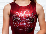 This festive and beautiful Mystique Spandex leotard is the perfect way to show your holiday spirit! The rich burgundy red leotard is adorned with a "Merry Christmas" Swirl motif in holographic sequin dots, and comes with a matching hair scrunchie. Whether you're performing in a holiday show or just want to show your holiday cheer, this leotard is perfect for you!