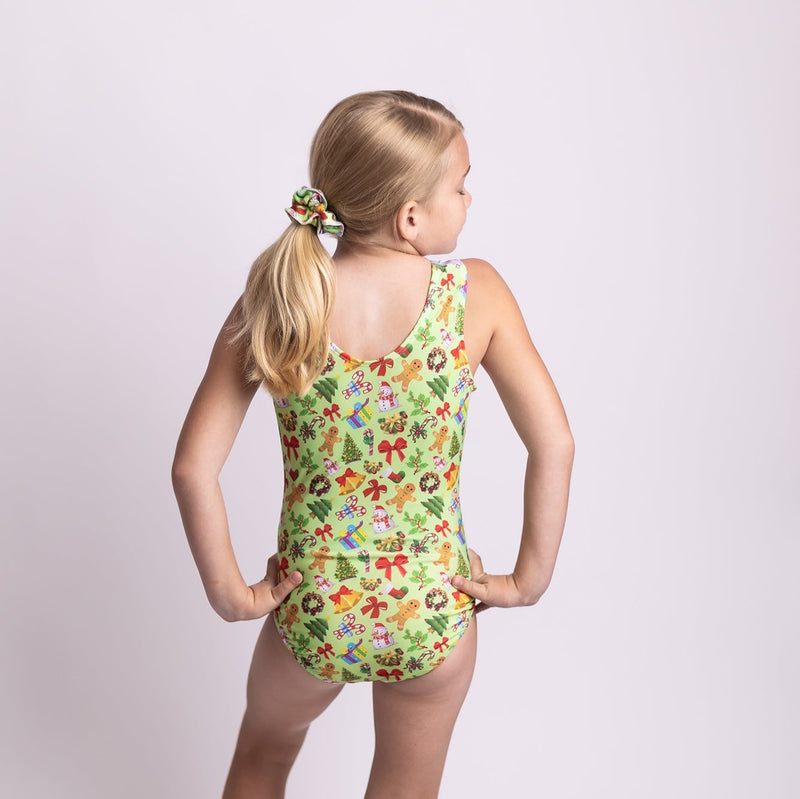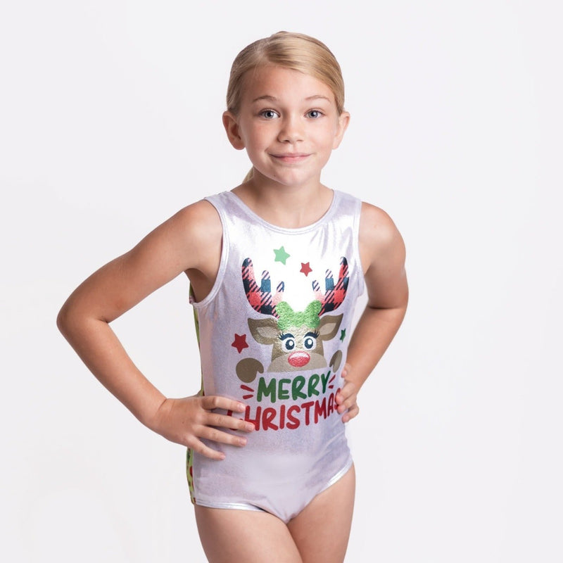 Experience the magic of the holidays in our Merry Christmas Reindeer Leotard! This gymnastics leotard is perfect for performances and competitions and even comes with a matching hair scrunchie for a complete and festive look. Spread joy and cheer with every routine in this must-have leotard!